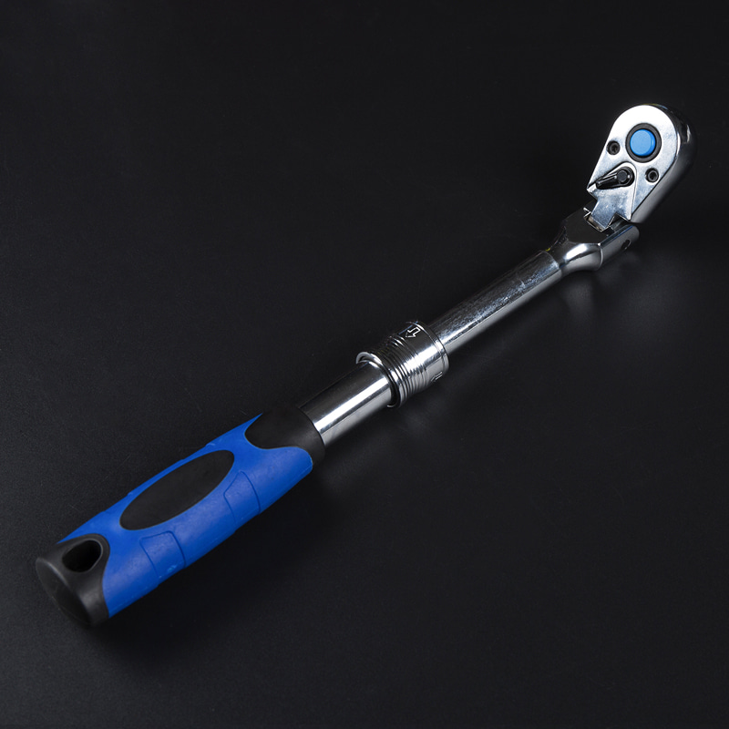 The Flex Head Extendable Quick Change Ratchet extends the handle to reach farther areas and get more torque. The 1/4 inch Ratchet has a telescopic range of 165-200mm, the 3/8 inch Ratchet has a telescopic range of 215-315mm, and the 1/2 inch Ratchet has a telescopic range of 290-420mm. The ratchet head is flexible enough to access the fastener from multiple angles.